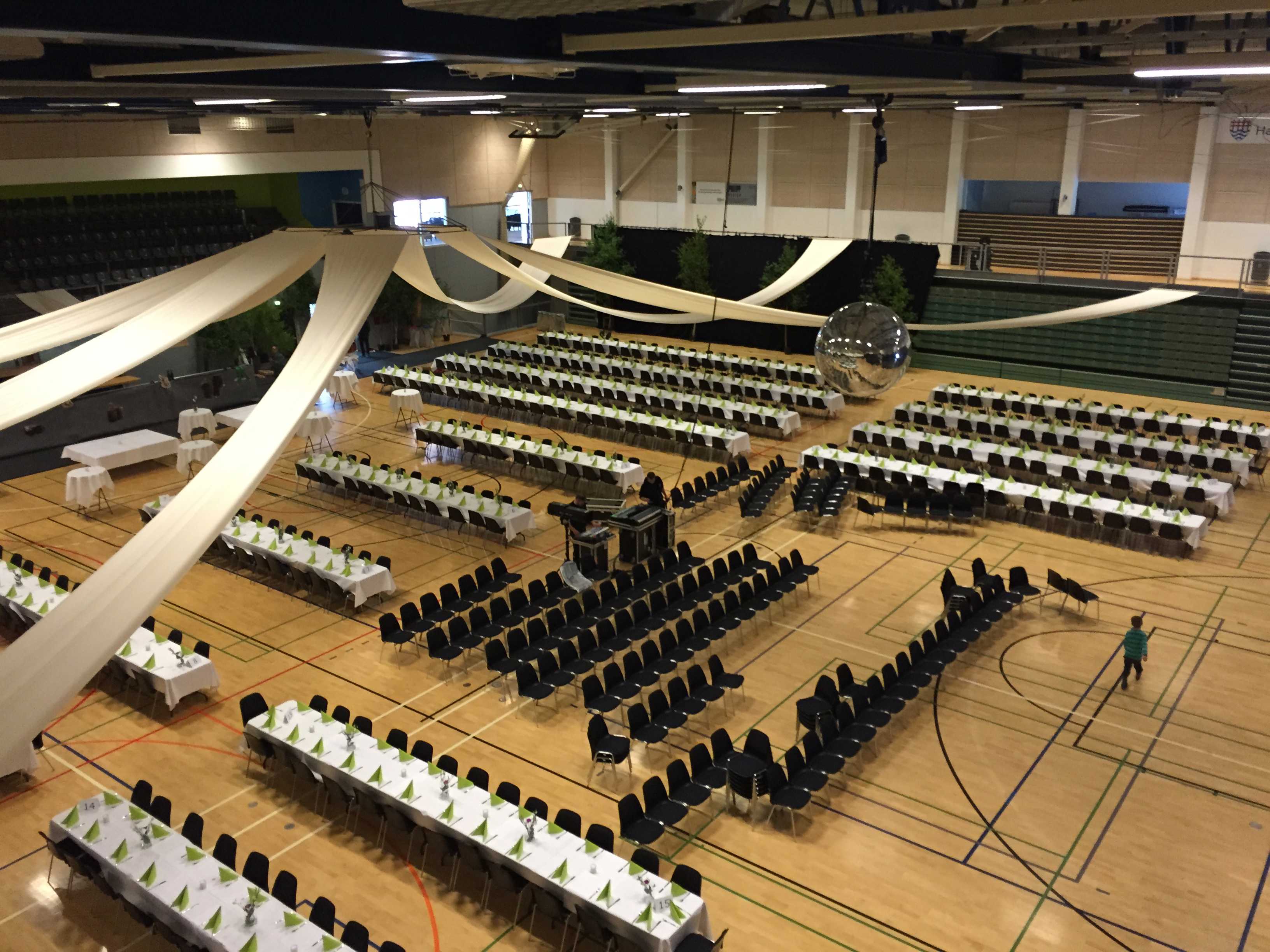 Haderslev Idrætscenters store arena har plads til 1.700 siddende tilskuere. Med sine to tribuneanlæg og integreret balkon har arenaen mange opbygningsmuligheder. Ønsker du en bestemt opsætning til arrangement, så hiv fat i os.